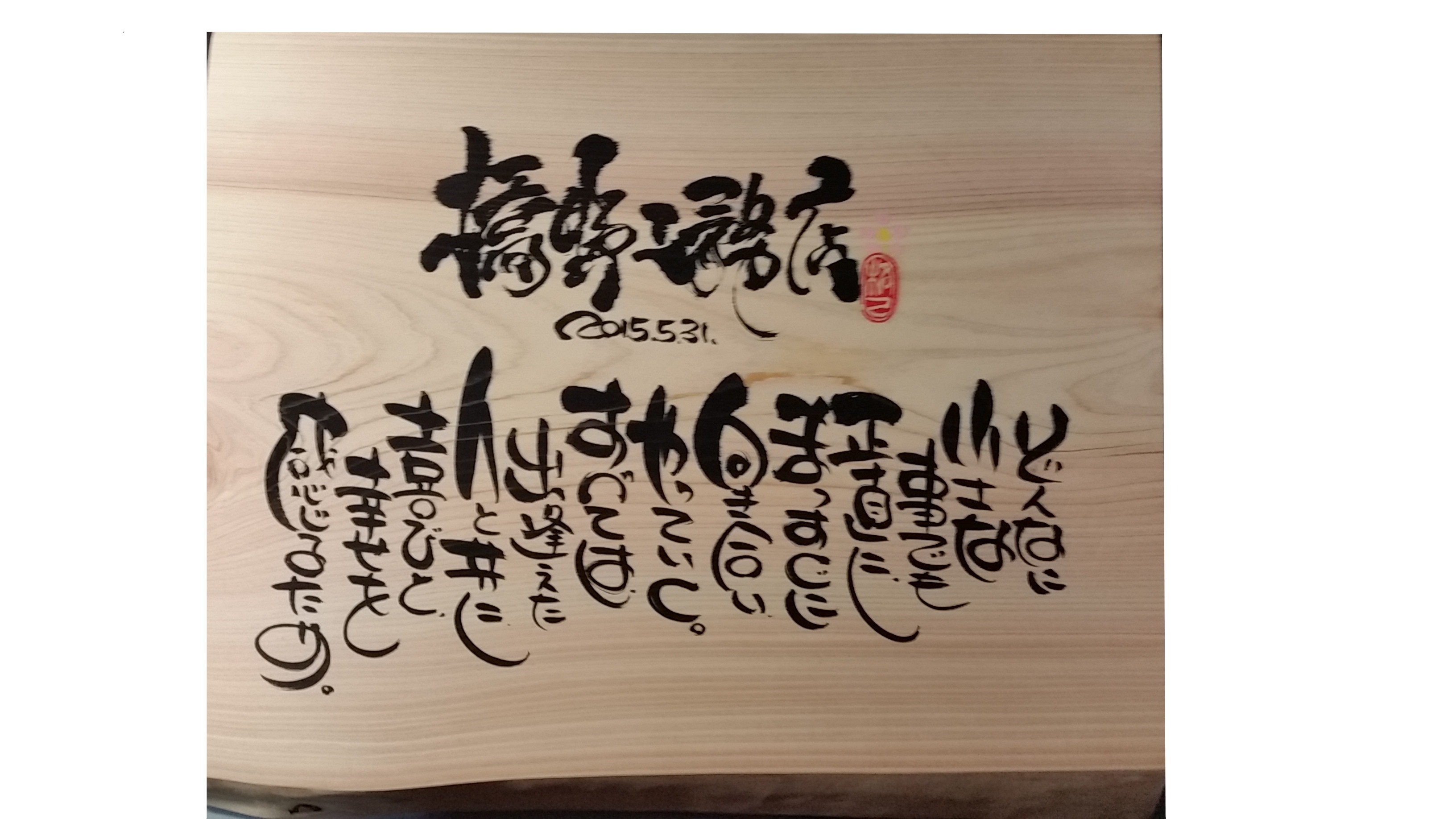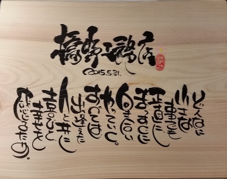当店代表の橋野勝治です。棚板一枚から内外装、全面改装まで、お客様のご要望にお応えする安心安全、丁寧な施工を心掛けております。初見のお客様、リピーター様、皆様方のお陰を持ちまして、創業30余年を迎えることとなりました。今後共、職人一同、お客様のご要望にお応えできるように、より良い品質の施工に取り組んでまいります。 (拡大画像 2015年 書家の先生作の桧板です)